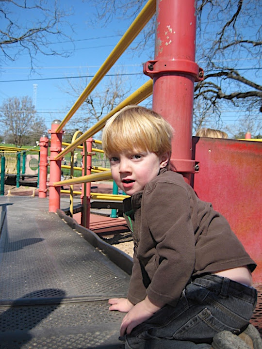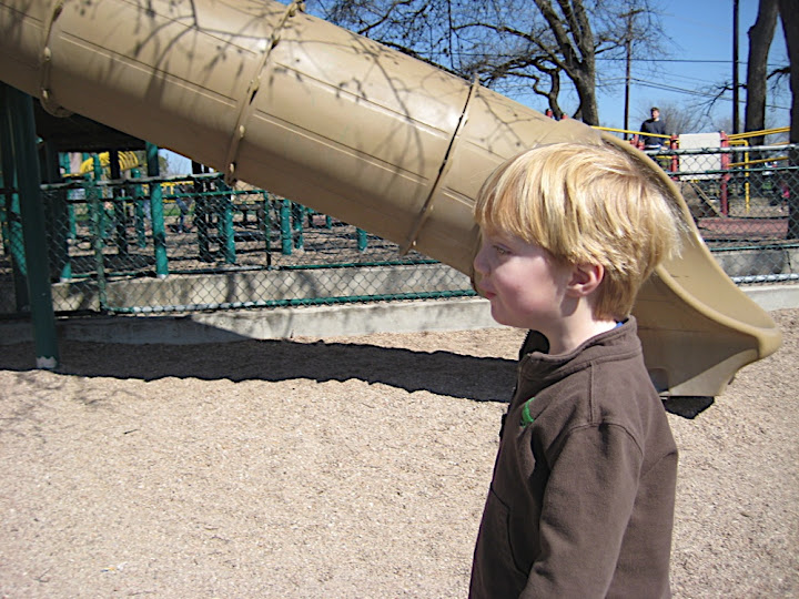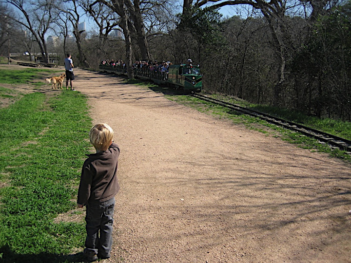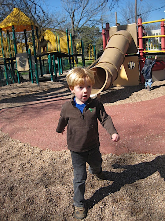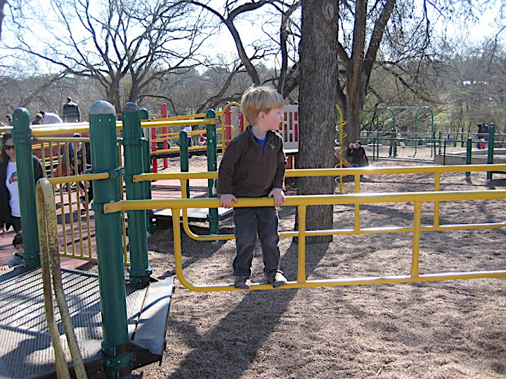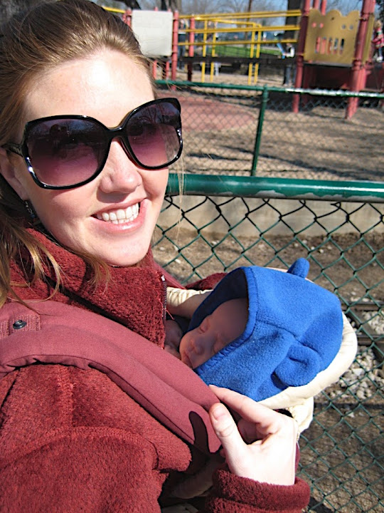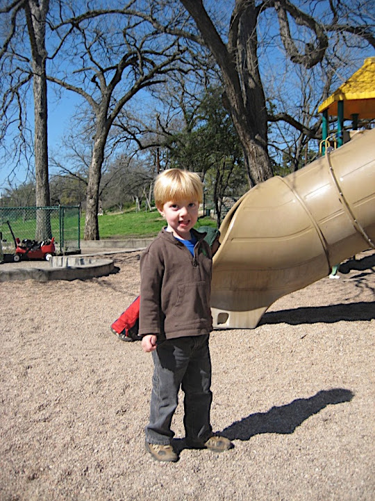 So far, the winter here seems to be following a pattern: 3 or 4 days of cold, drizzly rain, followed by gorgeous stretches of sunshine and perfect temperatures. The cold and rain have been annoying to Henry (and to his uncle Jeremiah, who sells a lot more hot dogs when it’s nice out). As soon as the sun breaks through, Henry starts demanding that we go outside. So today, we took the whole family over to Zilker park to play and enjoy the sunshine before the rain comes back tomorrow. George seemed to really enjoy the sunshine from the comfort of his baby carrier, and Sophie got to pee on lots of things before she’s stuck in the house again.